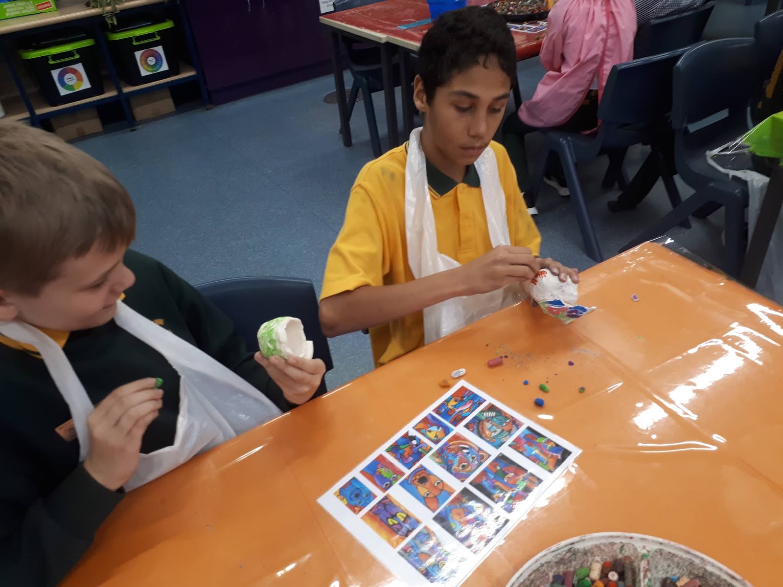 Creating shapes that represent the typical features of Fedro's paintings, the students created slab portraits out of clay. They attached them to a pinch pot and, once fired, added colour, using oil pastels and black ink.